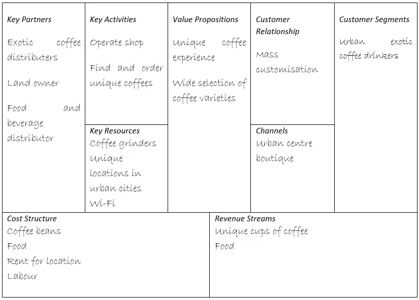 The value proposition is to deliver a unique coffee experience, where people can taste new kinds of coffee. For this she needs to have a shop within the urban center, where she can serve the coffee. The customer relationship is mass customization, as the service offered is similar for all customers. The key resources needed are thus a shop, coffee grinders and maybe Wi-Fi to attract more customers. The key activities will be to find and order the right coffee and serve it for customers in the shop. Key partners will be coffee distributors, a landowner (from who the shop can be rented), and maybe a food distributor, if food is going to be served. The major cost items will be coffee, food, rent, labor, and overheads. The revenue will come from selling coffee and food.