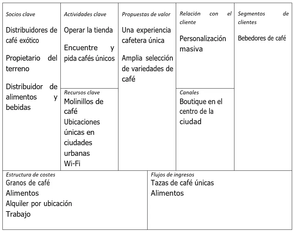 La propuesta de valor es ofrecer una experiencia de café única, en la que la gente pueda probar nuevos tipos de café. Para ello necesita tener una tienda dentro del centro urbano, donde pueda servir el café. La relación con el cliente es de personalización masiva, ya que el servicio ofrecido es similar para todos los clientes. Por lo tanto, los recursos clave necesarios son una tienda, molinillos de café y, tal vez, Wi-Fi para atraer a más clientes. Las actividades clave serán encontrar y pedir el café adecuado y servirlo a los clientes en la tienda. Los socios clave serán los distribuidores de café, el propietario del terreno (al que se le puede alquilar la tienda) y quizás un distribuidor de alimentos, si se va a servir comida. Las principales partidas de costes serán el café, la comida, el alquiler, la mano de obra y los gastos generales. Los ingresos provendrán de la venta de café y comida.