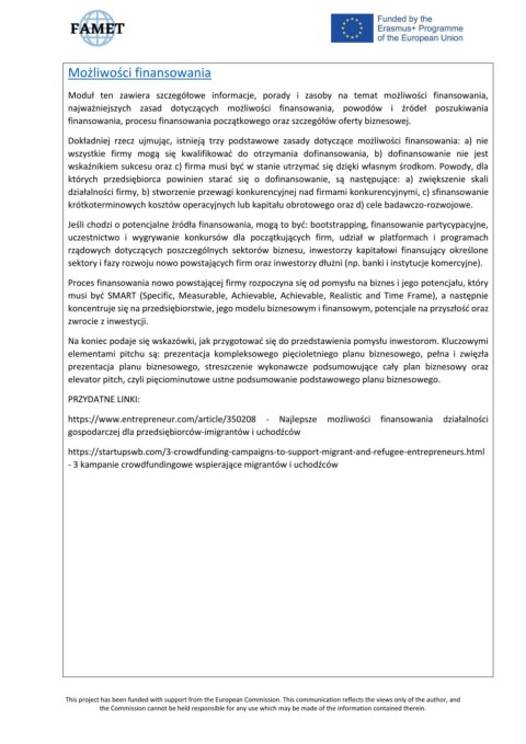 Moduł ten zawiera szczegółowe informacje, porady i zasoby na temat możliwości finansowania,