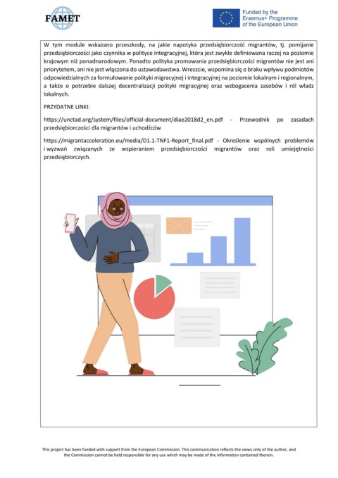 W tym module wskazano przeszkody, na jakie napotyka przedsiębiorczość migrantów, tj. pomijanie