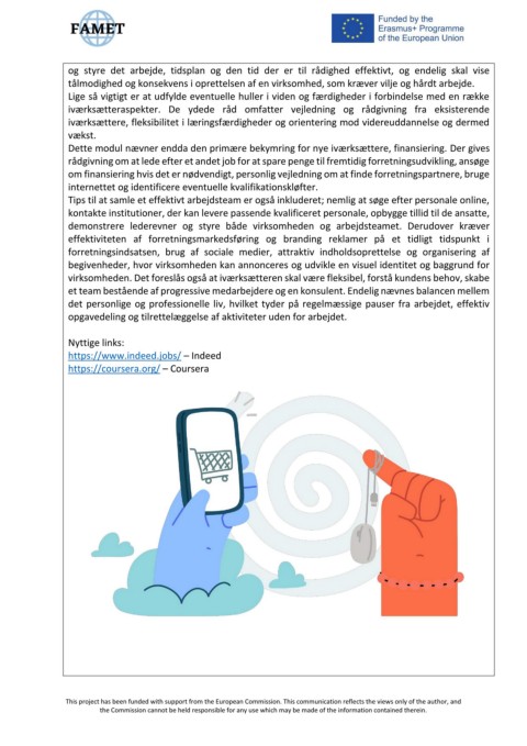 om finansiering hvis det er nødvendigt, personlig vejledning om at finde forretningspartnere, bruge